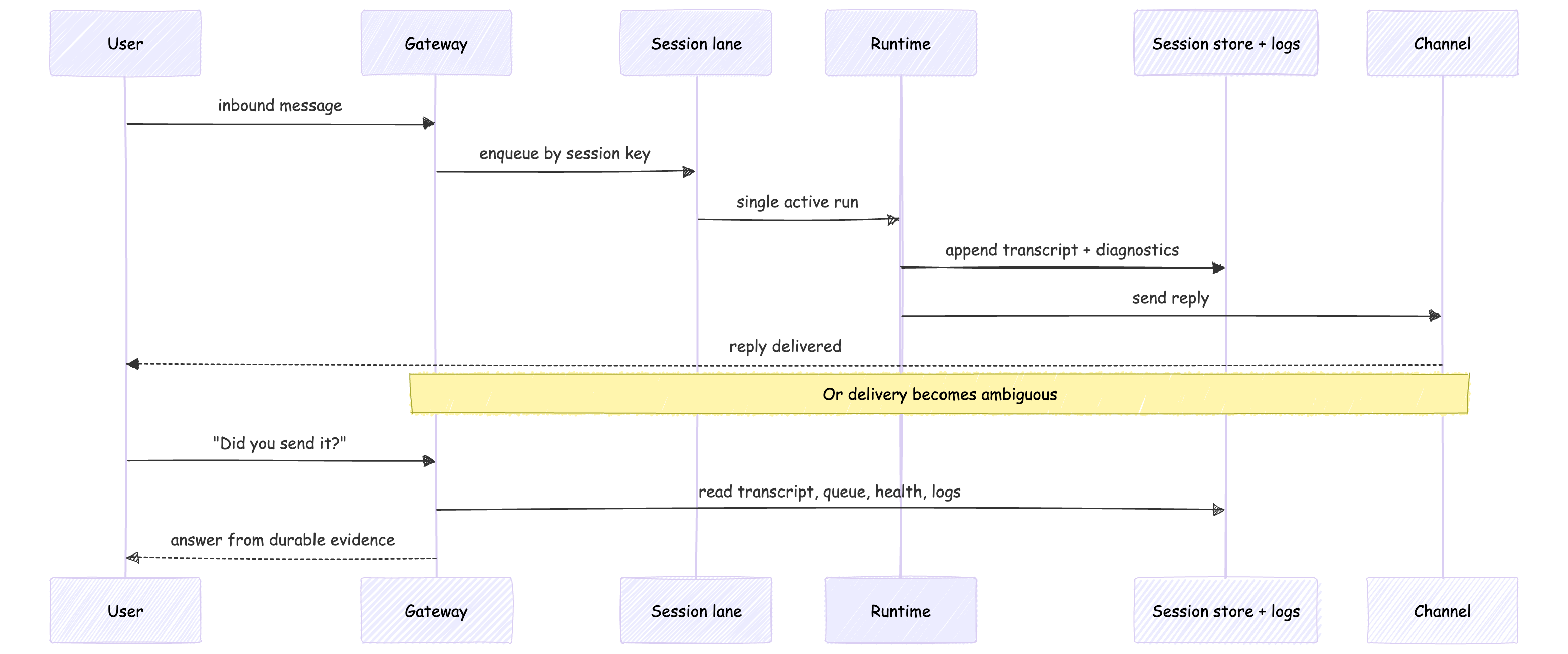 In production, you care about duplicate delivery after reconnects. You care about whether two inputs can touch the same session at once. You care about whether the Gateway can still tell you what happened after a restart. You care about whether one shared agent quietly became one shared permission set.