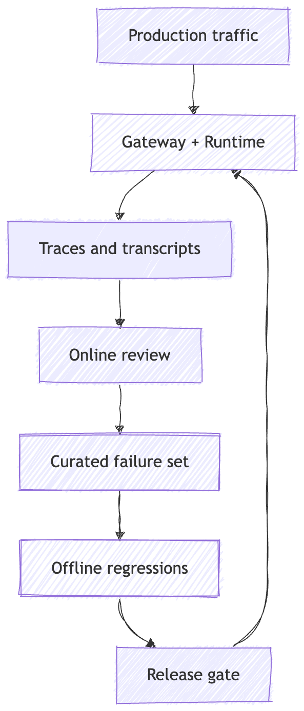 What makes them trustworthy in production is bounded behavior and durable evidence. The Gateway / Control plane has to enforce invariants. The Runtime / Data plane has to leave a trail. Operators need logs, health, transcripts, and recovery paths. Builders need evaluation that turns incidents into repeatable tests.