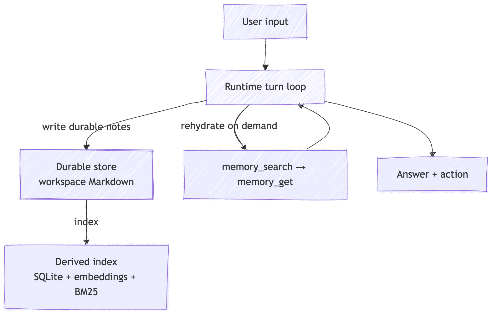 OpenClaw builds a per-agent index over memory files, watches for changes, debounces updates, and schedules sync so the index stays reasonably fresh without making chat feel sluggish.