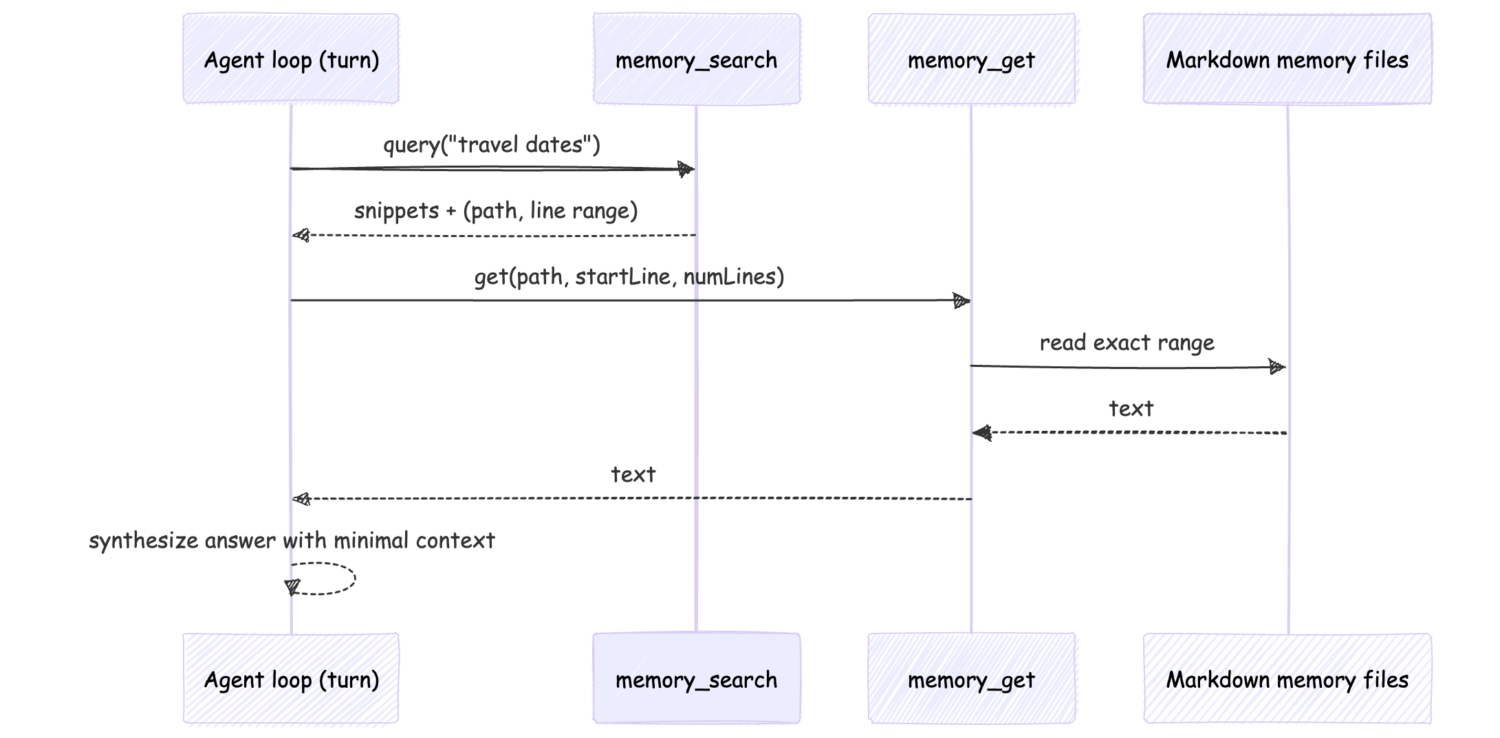 memory_searchfinds relevant snippets (discovery)memory_getreads the precise file / line range you actually need (retrieval)